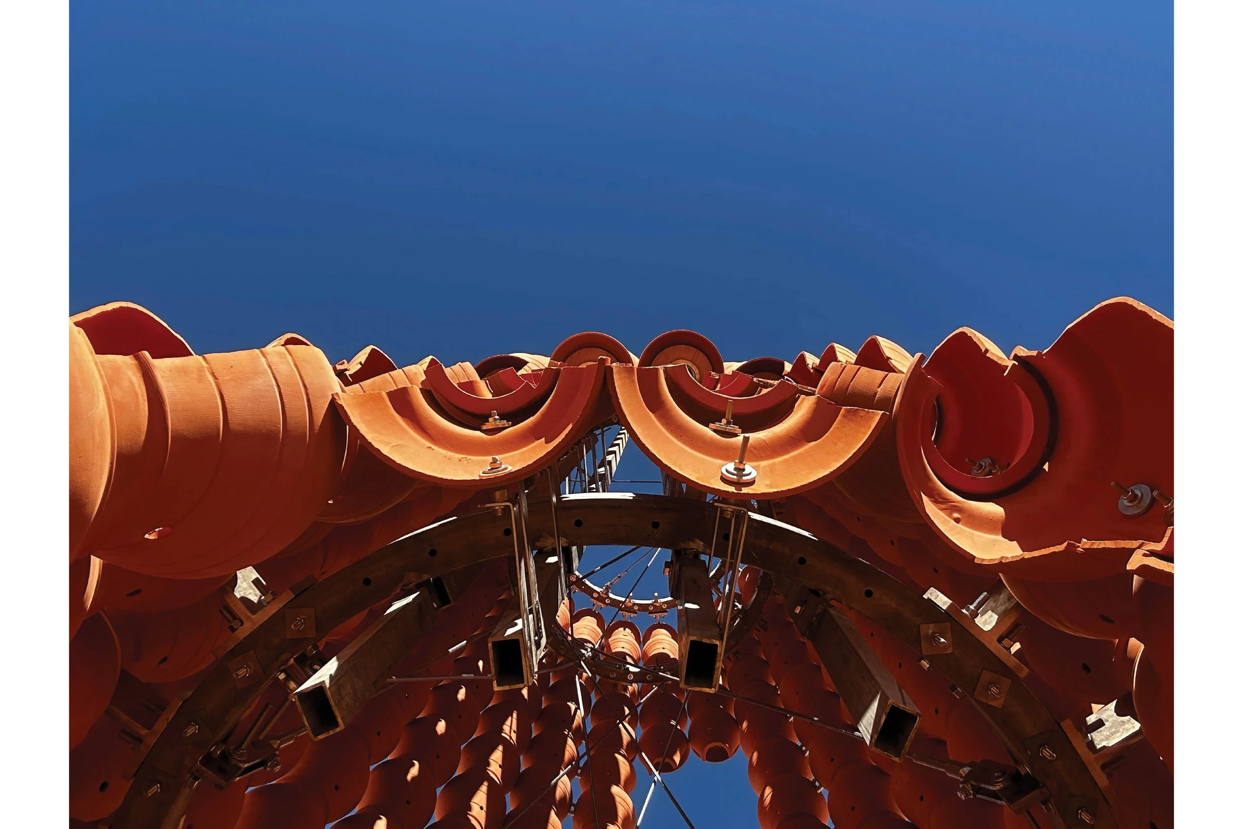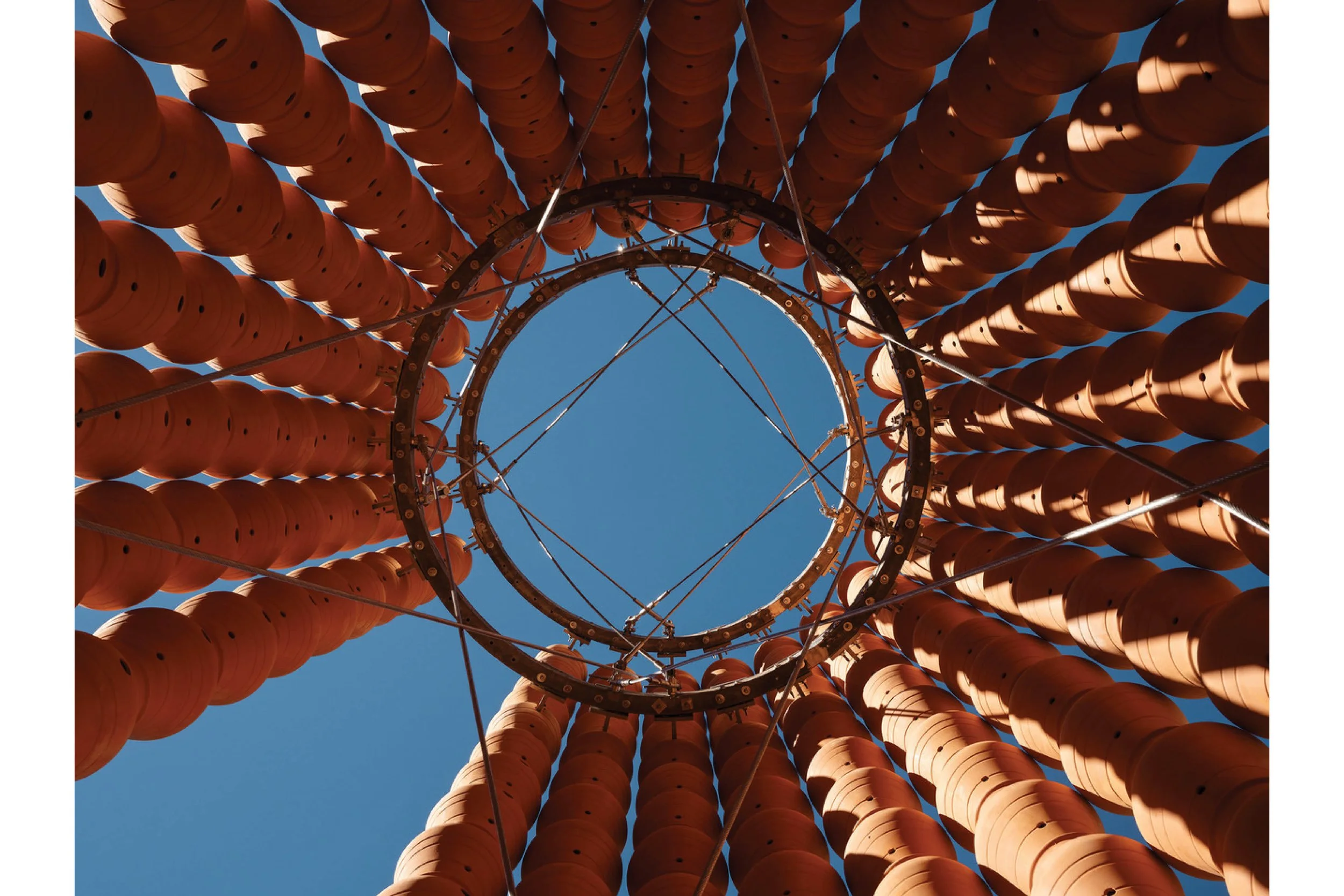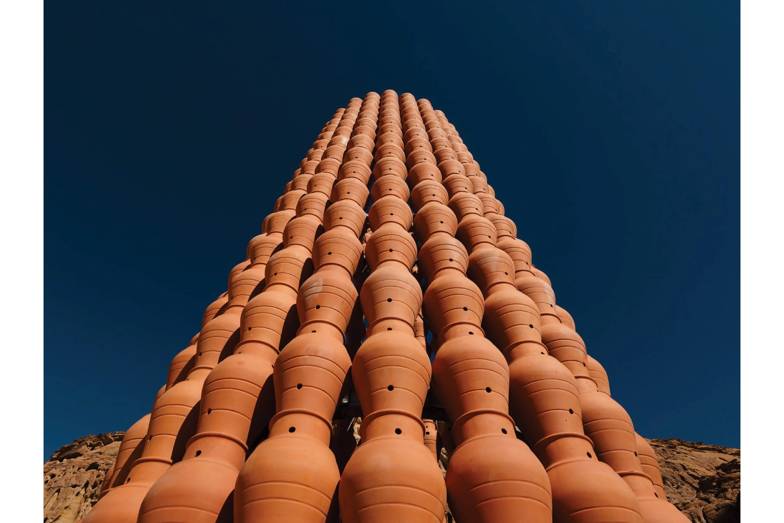 The medium-sized tower serves as a welcoming beacon, inviting visitors to enter through a passage flanked by columns of jars, each bearing a peeled quarter reminiscent of the erosive patterns found in the surrounding landscape. As visitors traverse this threshold, they are enveloped in a dance of light and shadow, cast by the jar-stacked columns, creating a dynamic interplay between the manmade and the natural elements. This immersive experience fosters a deeper connection between visitors and the artwork, as they engage with the inherent beauty and harmony of the site.